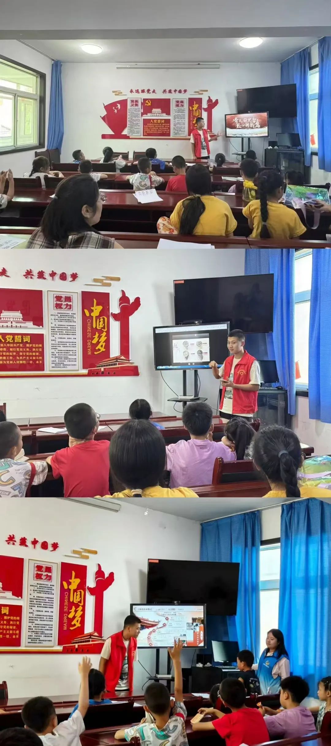 “大家看这张图片,就是瓦当,上面的花纹叫‘云纹’,古人觉得云彩能带来雨水,保佑庄稼丰收。”队员指着投影中的图片介绍,同时展示了提前准备的瓦当仿制品和瓦片标本,让孩子们直观感受不同瓦件的形状与质感。针对低年级小朋友的认知特点,宣讲重点落在“瓦当的故事”“脊兽的名字”等趣味内容上,用通俗的语言串联起从战国到明清的瓦作演变脉络,让孩子们了解到身边老房子上的砖瓦,原来是承载着历史的“文化符号”。