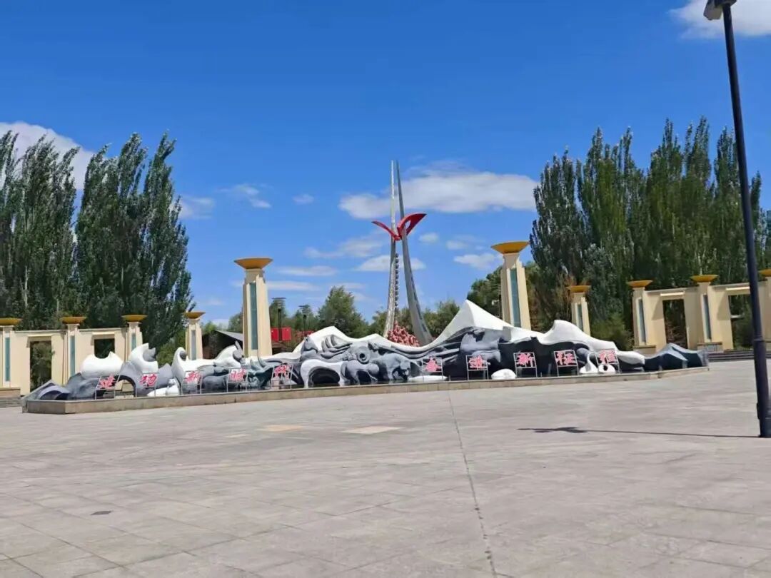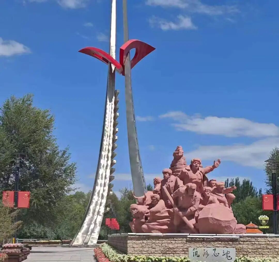 随着实践团成员们踏入公园之后,首先映入眼帘的是“筑路忠魂”雕塑。雕塑中的慕生忠将军目光如炬,仿佛在凝视着远方的天路。身旁的筑路战士们,手持简陋工具,却充满着无畏的勇气。