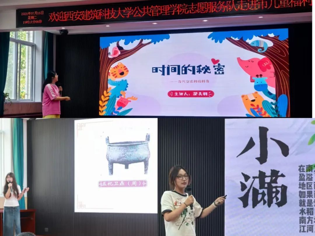 实践队围绕文化传承与科学启蒙,为福利院儿童打造多元科普课堂。《假如国宝会说话——陕历博文物介绍》,借动画短片与趣味文物故事,带孩子穿越历史,触摸青铜器、唐三彩的文化温度,播种下文化自信的种子;《二十四节气的秘密》结合自然现象与农耕智慧,用节气歌谣串联知识,让孩子们在观察自然、理解传统中,学会与生活对话;《时间的故事》演示日晷、漏刻等古代计时工具,解锁历法科技密码,拓宽科学视野。实践队员精心准备的每一堂课都紧扣福利院未成年人成长需求,让科普课堂不只是 “知识传递”,更是 “心灵陪伴”。