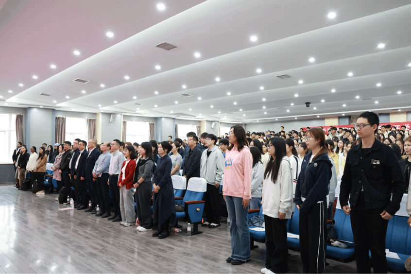 在雄壮的国歌声中,典礼拉开帷幕。全体师生肃立齐声高唱国歌,为新生的大学征程奏响庄严序曲。