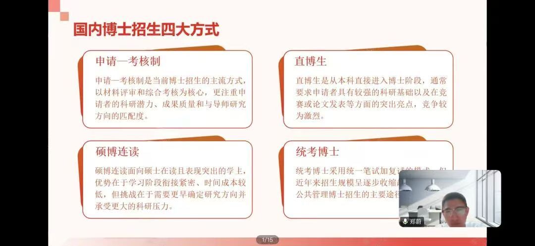 郑蔚同学为有志于深造的同学全面讲解了国内博士“申请-考核制”的主流流程。他从科研积累、导师选择与匹配、申请材料准备、邮件发送技巧,到复试考核准备等各个环节都提供了详尽的建议,并强调提前规划、持续产出科研成果是申博成功的关键。