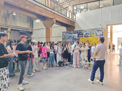 工业遗产活化:城市更新的“新旧共生”样本:7月3日,实习团队首站探访西安老钢厂设计创意产业园。作为西安工业遗产改造的典型案例,园区保留了原西安冶金机械厂70%的工业结构——斑驳的红砖墙体、高大的钢架车间、锈蚀的机床齿轮经改造后,与现代文创办公空间、景观装置有机融合,形成“生产、生活、生态”三位一体的产城融合格局。据园区工作人员介绍,改造过程中通过结构加固与功能重构,既保留了“抓革命、促生产”等历史印记,又引入近百家设计企业,实现了文化价值与经济价值的双重提升。这一实践让大家直观理解了“城市更新不是简单拆旧建新,而是在历史文脉延续中注入新功能”的专业内涵。