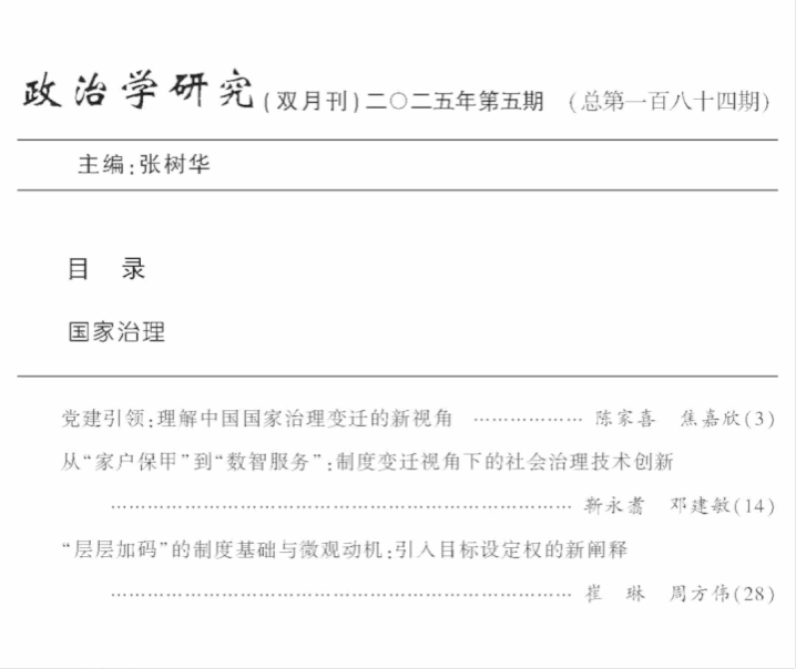 近日,我校Ray竞技官网靳永翥教授与管理学院博士研究生邓建敏合作,在我国政治学领域顶刊、学校认定公共管理类 A 级期刊《政治学研究》2025 年第 5 期发表题为《从 “家户保甲” 到 “数智服务”: 制度变迁视角下的社会治理技术创新》的学术论文,为理解中国社会治理演进逻辑与实践优化提供重要参考。 论文直面当前制度研究领域的核心痛点 ——“为何部分设计完善的制度难以在实践中有效落地”,通过梳理我国传统社会 “家户保甲”...